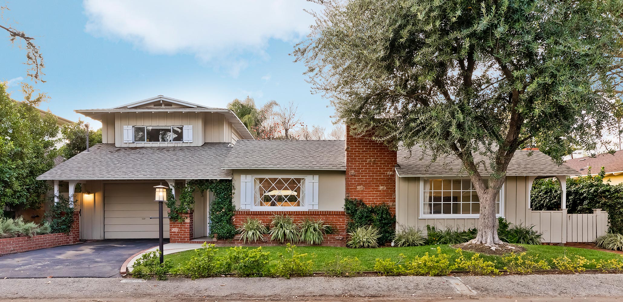 Lovely redone home on a beautiful tree lined street in prime Studio City! The living room offers vaulted beam ceilings, wood flooring, decorative fireplace and wood paned windows. There is a cozy gaming room, office, library, or TV nook off the living room. A quaint sitting area with another decorative fireplace provides a lovely transition to the newly added kitchen and dining room. The cook’s kitchen is beautifully outfitted with two toned cabinetry, high-ceilings, skylights, loads of storage and a double set of French doors opening out to the charming brick courtyard. Also, on the first floor is a bedroom and bathroom. The 2nd floor features two extra-large bedrooms with vaulted beam ceilings and a bath with double sink vanity. There is a separate office with built-in shelving, an art studio and a half bath. The brick courtyard opens onto a lush grassy yard and firepit.